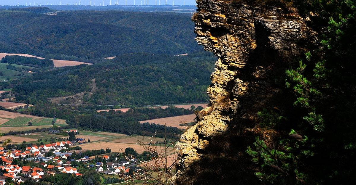Über das „Blaue Wunder“, einem ehemaligen Werrasperrwerk der Grenztruppen, wandern Sie auf dem Kolonnenweg bergauf zum Sattel Schnellmannshausen. Ein schmaler Pfad führt Sie über Treppen und durch Steinklippen zum 503 Meter hohen Heldrastein.