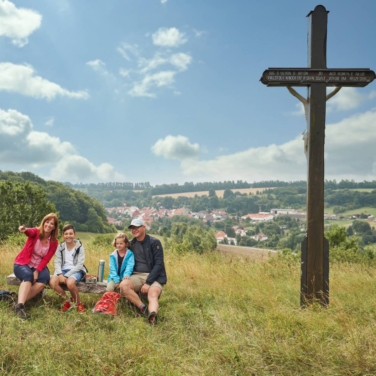 Leicht bergab, an Wiesen und Feldern vorbei, bezaubert nun der Galgenkopf mit seinem Rundumblick. Die Wanderroute führt Sie weiter zum Dorfrand von Kreuzebra, eines der ältesten Dörfer des Eichsfeldes. Nach dem Hasengrund mit seiner malerischen Allee, haben Sie den sanft ansteigenden Weg zur Burg Scharfenstein fast geschafft. Hier bietet sich Ihnen ein sagenhafter Weitblick ins Eichsfeld, auf das Ohmgebirge und bis hin zum Harz.